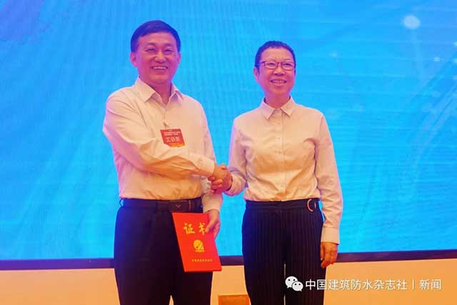 中國(guó)建筑防水協(xié)會(huì)常務(wù)駐會(huì)副會(huì)長(zhǎng)苗燕向胡希寶頒發(fā)瓦屋面分會(huì)副秘書長(zhǎng)證書。