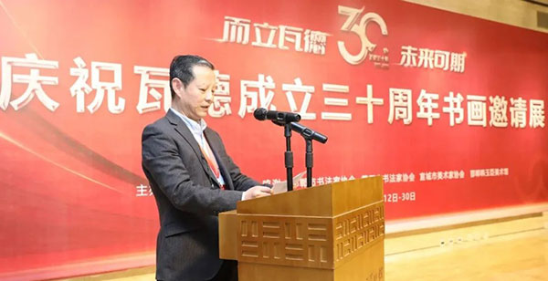 瓦德集團(tuán)董事長謝富強(qiáng)向與會(huì)的各路藝術(shù)家及賓朋表達(dá)了熱情歡迎。向河北邯鄲、湖北黃石、安徽宣城三地文聯(lián)、書協(xié)、美協(xié)和書畫家們的大力支持表達(dá)了衷心感謝。尤其對(duì)中國知名書畫家,邯鄲市書協(xié)主席,文化名人,著名企業(yè)家韓玉臣先生對(duì)瓦德集團(tuán)慶典活動(dòng)的鼎力支持表達(dá)了深深的敬意和由衷地感謝。在三千年歷史的趙國都城邯鄲,能有瓦德集團(tuán)如此注重文化藝術(shù)的實(shí)屬難得,能將深厚的中國文化的脈絡(luò)注入到自己的企業(yè)產(chǎn)品中非常難得。